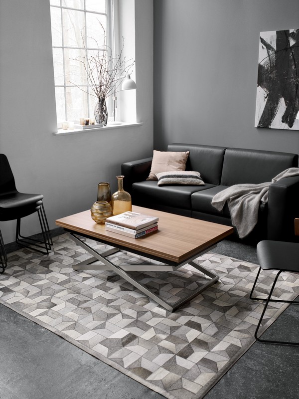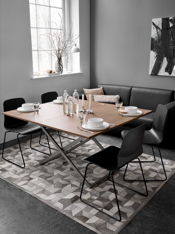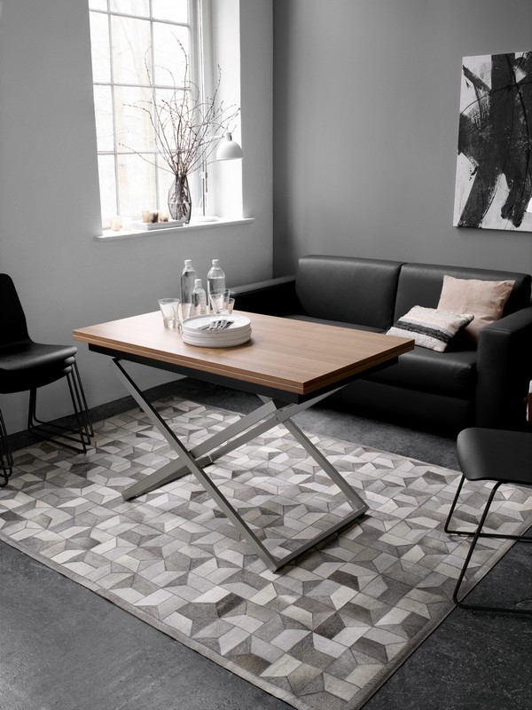 Să ai în vedere că trebuie să lucrezi cu spațiul pe care îl ai. Dacă nu ai loc pentru o zonă dedicată de dining, adica o masa mare care să îți ocupe loc în permanență în camera de zi, atunci poți opta pentru o măsuță de cafea extensibilă, care se transformă rapid într-una mare. În exemplul de mai jos este masa Rubi de la BoConcept.